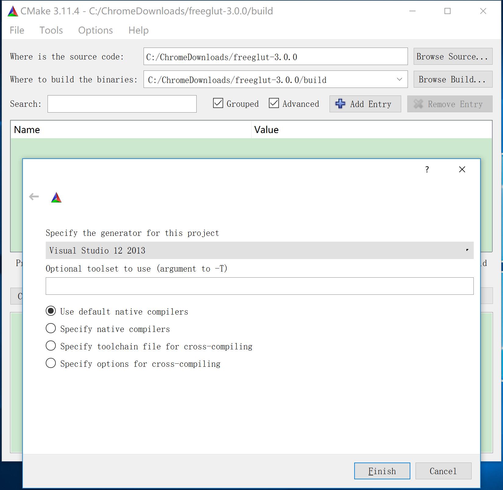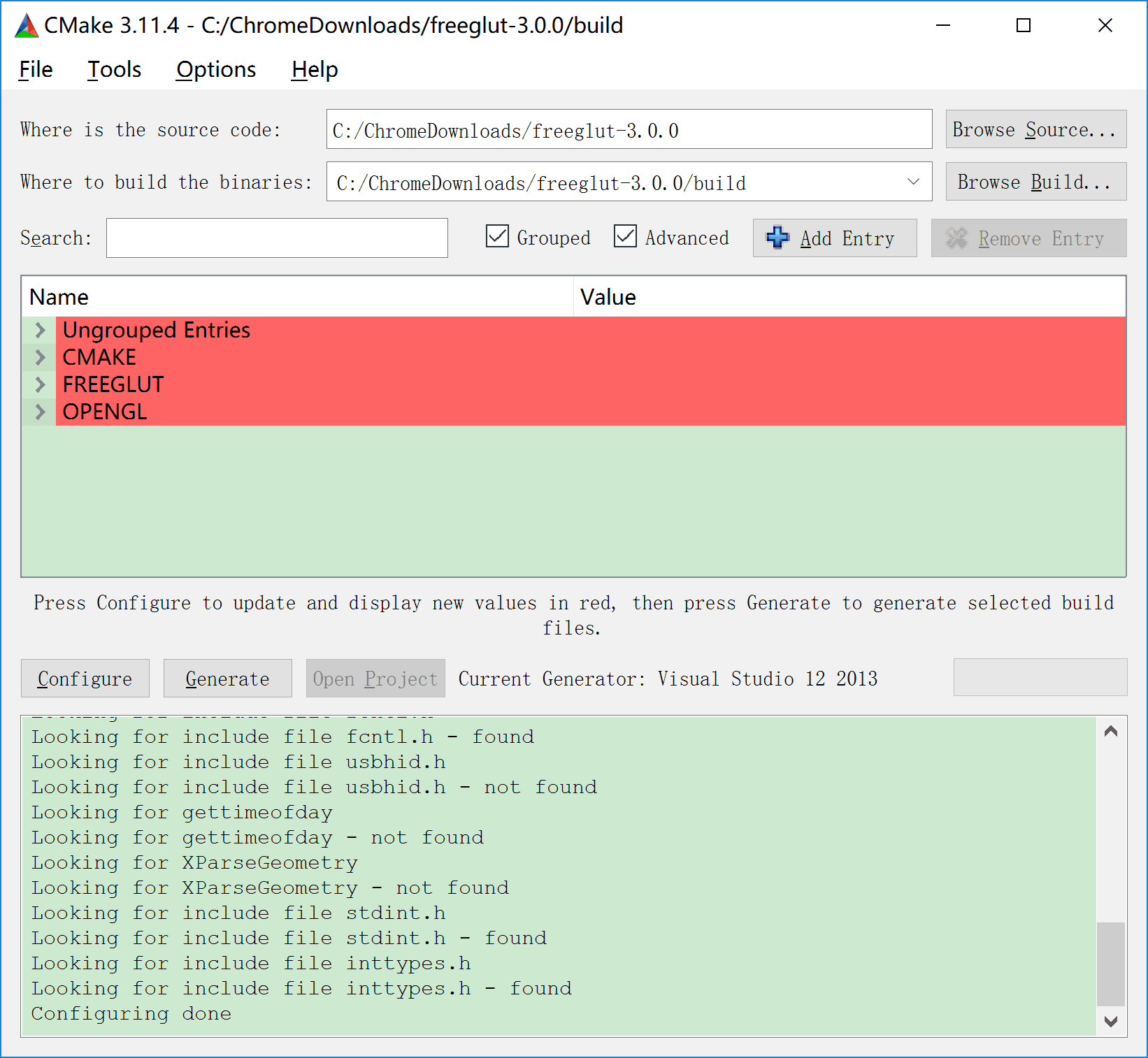 先编译freeglut,打开CMake,设置好路径,点击Configure,确认创建新文件夹 build,选择 VS 12 2013,不要选择 64 位的(我也不知道为什么,64位的配不好,应该是很多东西默认是32位)。