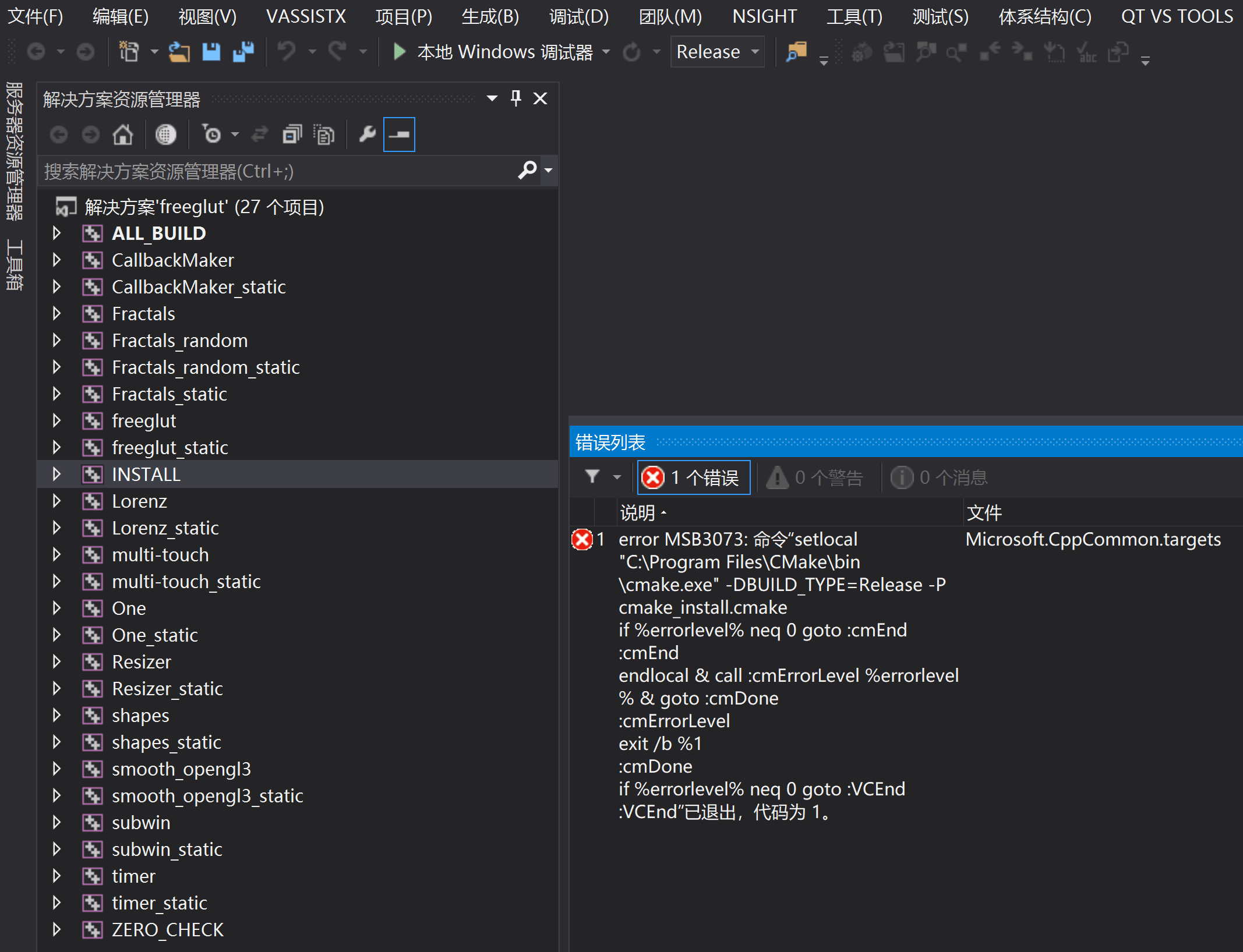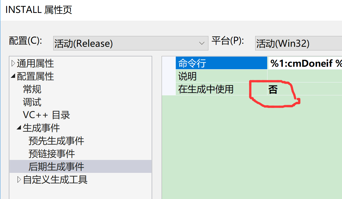 生成 ALL_BUILD,然后生成 INSTALL,生成INSTALL的时候我报了个错如下,解决方法就是右键 INSTALL,“属性” -> “生成事件” -> “后期生成事件” -> “在生成中使用”,改为 “否”。(后边还有这样的 error MSB3073: 命令 setlocal 。。的问题都这么解决)。重新生成后,应该可以看到