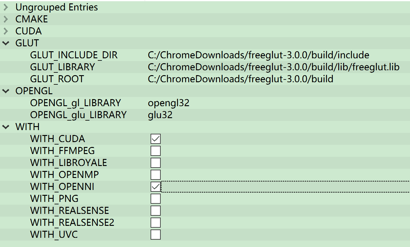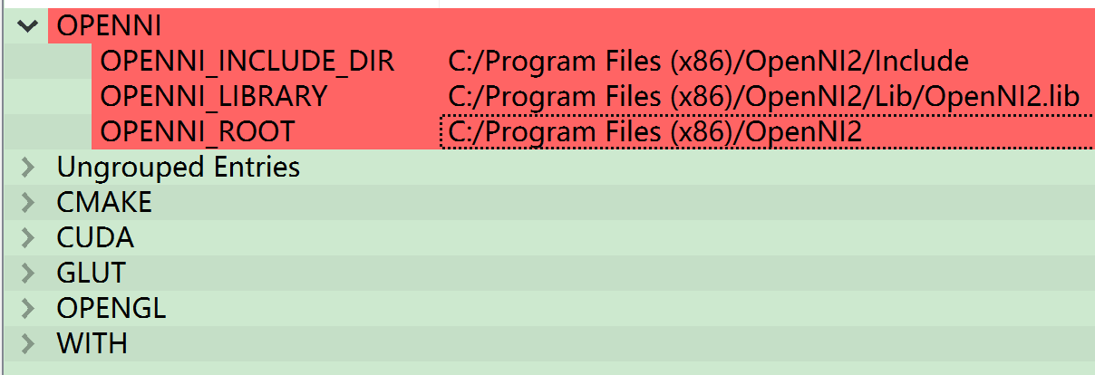 同样方式CMake InfiniTAM,确认创建新文件夹 build,同样用 vs 12 2013(不要用x64),会报错,因为有很多东西需要手动配。将glut目录手动修改到刚才编译的地方,并将 WITH 中 “WITH_OPENNI” 选上,Configure,会出现 OpenNI的条目,