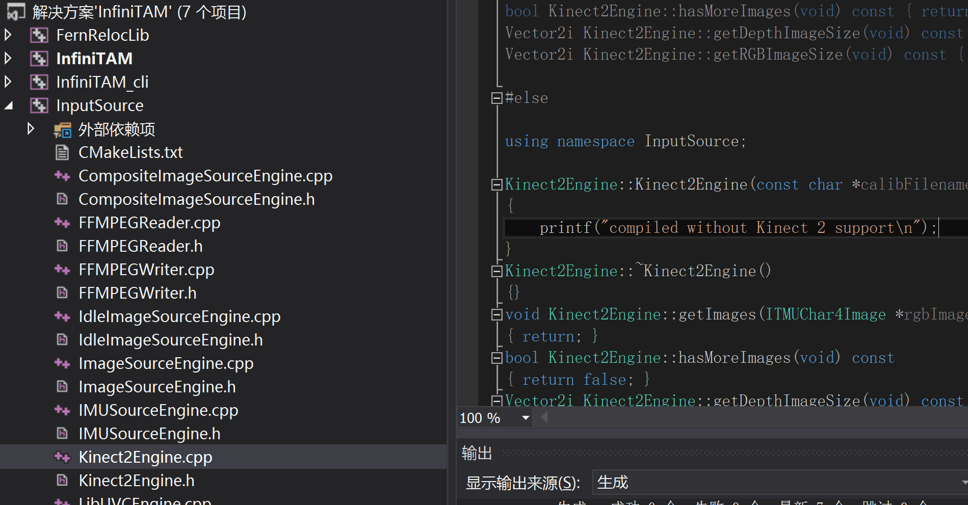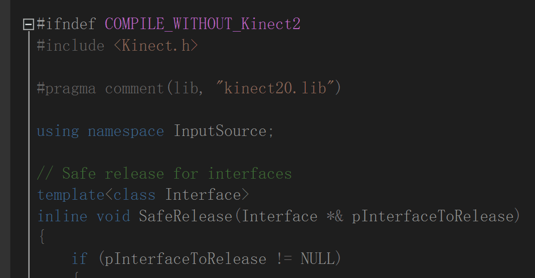 但是,凡事就怕 “差不多”,可以看到上边的提示就是 “compiled without Kinect 2 support”,我的直觉就是这句话一定是程序中的输出,直接搜就搜到了,在 InputSource 项目下,Kinect2Engine.cpp里,输出了这句话。这是因为上边的 #ifndef 没有成功,但是全局搜了 “COMPILE_WITHOUT_Kinect2” 这个宏也没有别的地方有,我就把这句话删了,让它强制执行下边的有 kinect 的代码,然后把后边相应的 #else 和 #endif 里的代码都删了。可以看到需要 Kinect.h 这个头文件,以及 Kinect20.lib 这个库。