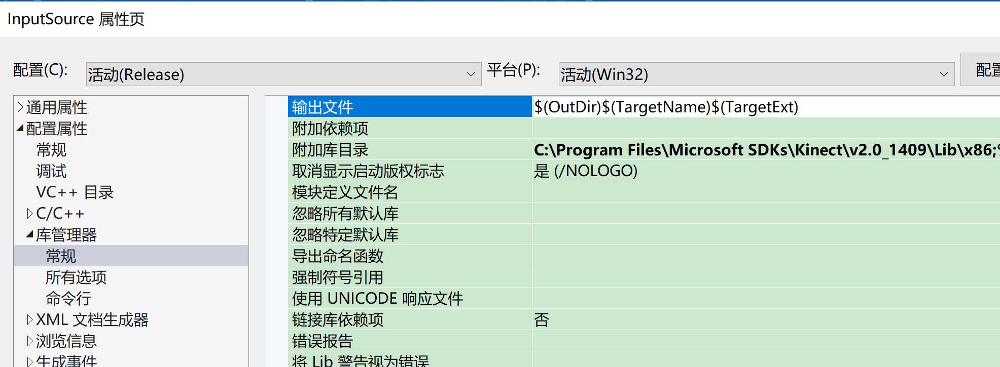 在第二项装OpenNI的时候,应该就已经装了kinect,用 Everything 搜一下就能找到 kinect.h 和 lib 的目录,把两个目录添加到InputSource的附加包含目录和库目录里,注意要用 x86 的库!我的是头文件目录是 “C:\Program Files\Microsoft SDKs\Kinect\v2.0_1409\inc”,库目录是 “C:\Program Files\Microsoft SDKs\Kinect\v2.0_1409\Lib\x86”。同时确认是在 release 模式以及 win32 下的配置。