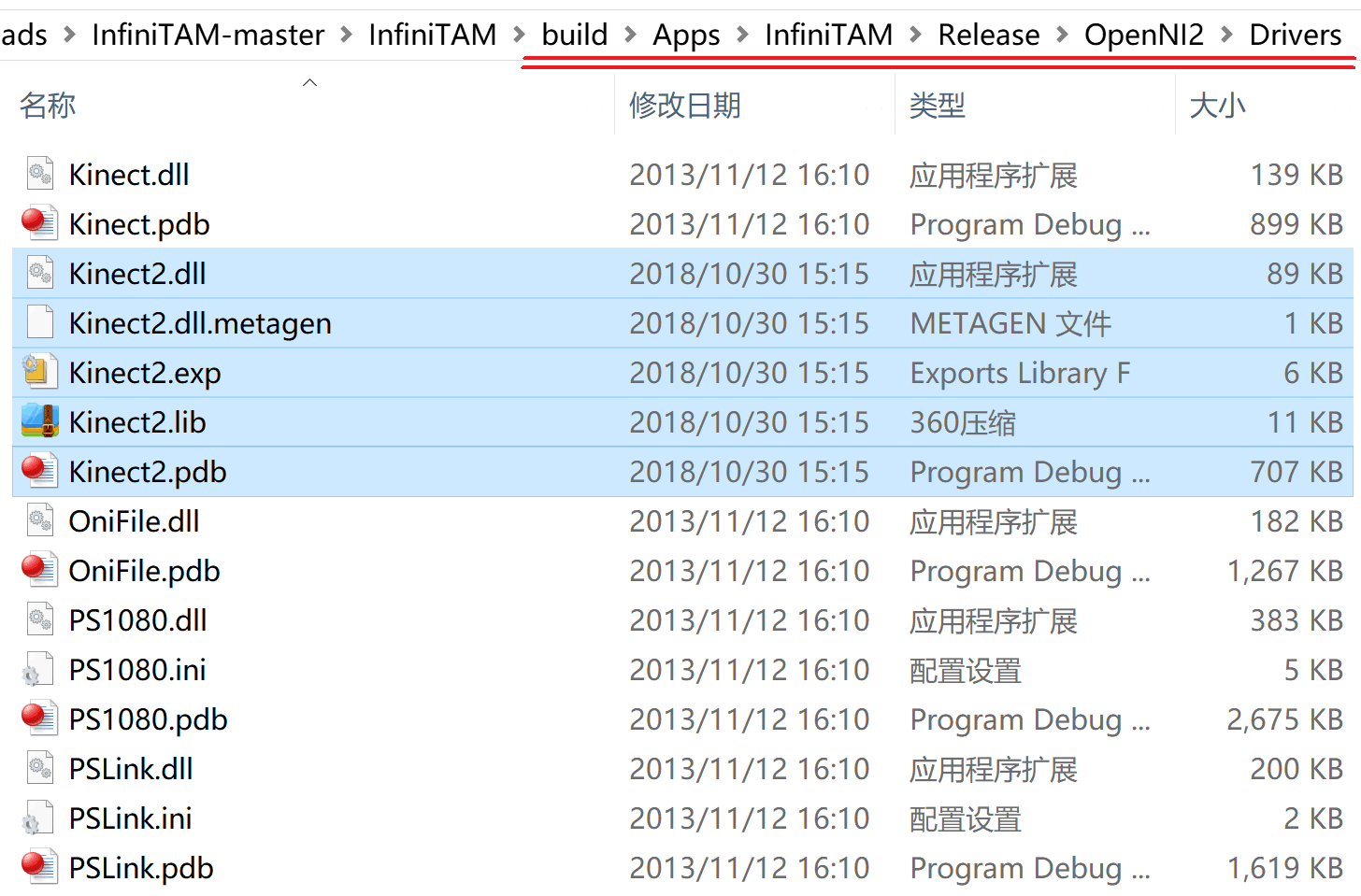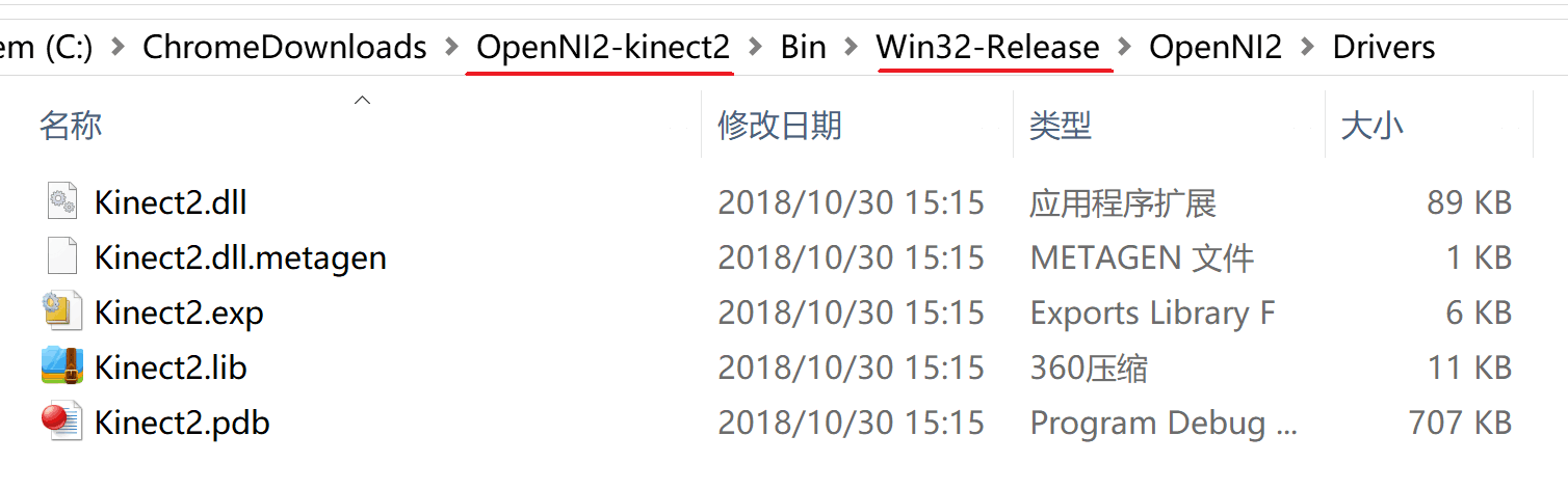 还是 还是 no devices found,真是醉了,这个是因为 OpenNI里驱动力是 Kinect 1 的驱动(没有试过 Kinect 1 是不是到这里就已经可以了),需要换成 Kinect 2 的。在第二步的时候是装了 Kinect 2 的驱动的,用 Everything 搜 Kinect.dll 就可以找到,注意要使用 32 位的。把下图文件夹中的所有文件赋值粘贴到我们exe的路径下的 OpenNI 文件夹下,可以看到他里边原来是有 Kinect.dll 的,如果不用其实可以删了。