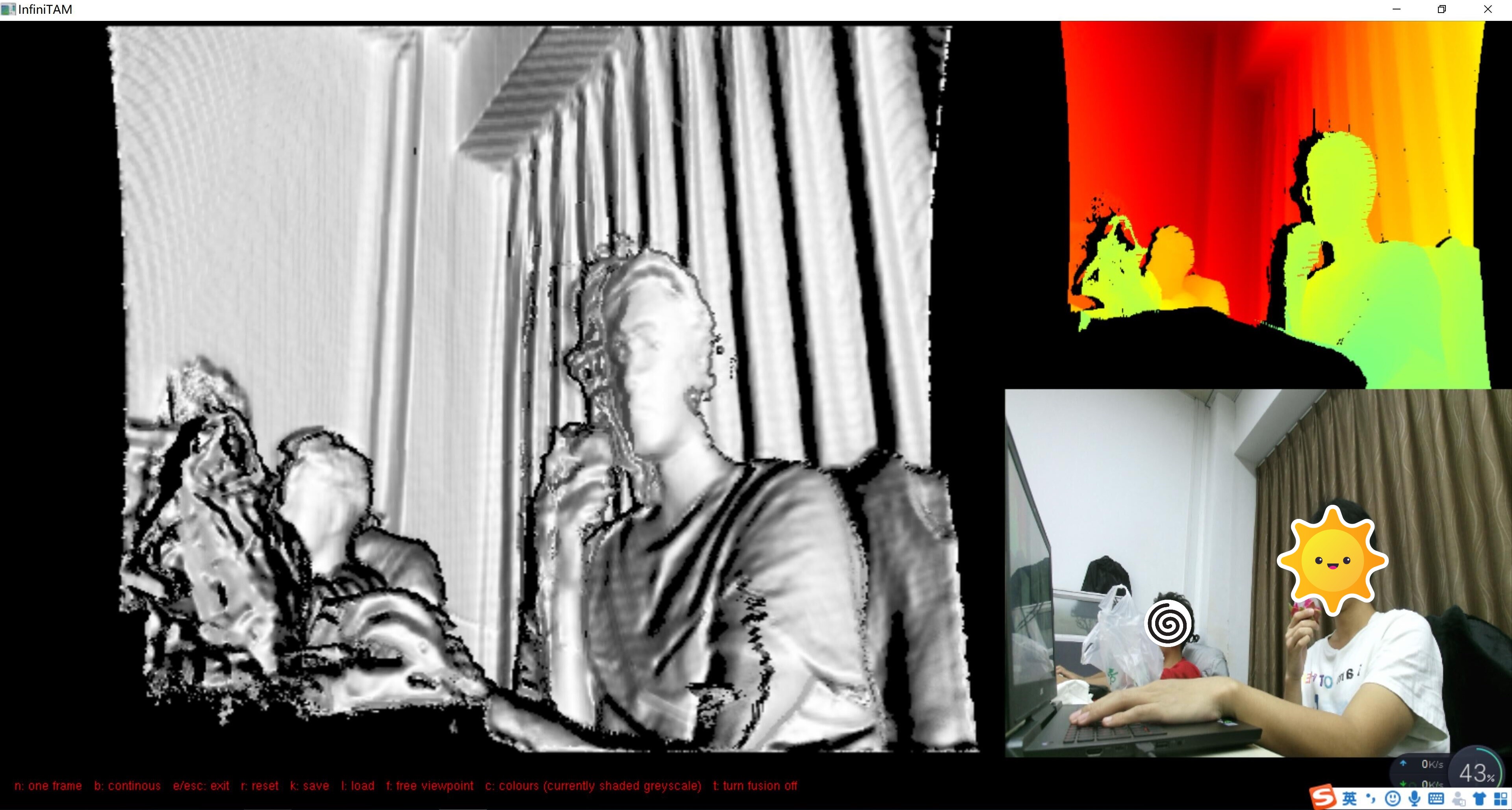 避免枯燥先放两个结果,一个是不用深度相机,用它给的很多帧的数据跑的泰迪熊的效果,一个是我用 Kinect v2.0 跑的效果。(CSDN的博客 gif 只能5MB以内,只能这个分辨率了,我的效果就放一张图好了,因为是实时重建的,随便截了一张图,效果不是很好- -,不过整体的效果确实也不是很好)。