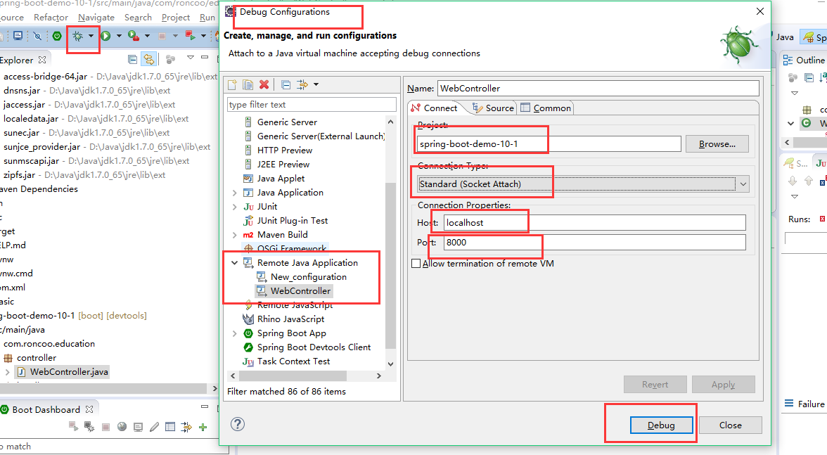 debug 右侧下拉箭头--debug configuration--remote java application 右键/new--project(远程项目对应的本地代码项目)--connection type(standard socket Attach)--Host(远程ip)--port(远程监听端口8000)--debug按钮。
