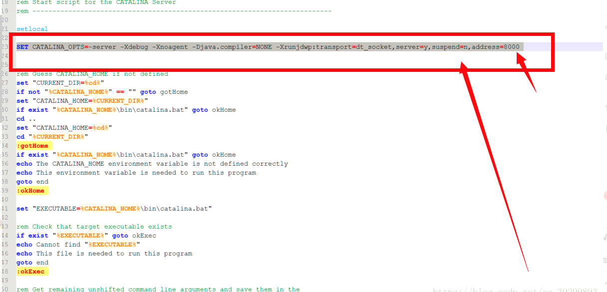 3.如果失败,远程服务器修改apache-tomcat-7.0.65\bin的startup.bat文件,文本格式打开,添加 SET CATALINA_OPTS=-server -Xdebug -Xnoagent -Djava.compiler=NONE -Xrunjdwp:transport=dt_socket,server=y,suspend=n,address=8000 这句话后保存。