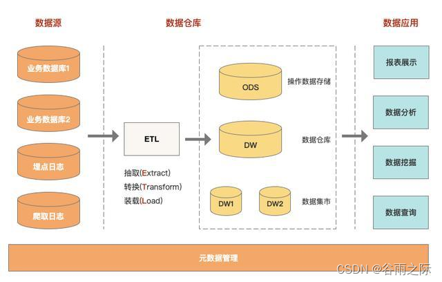 基于以上两个主要需求,1990年比尔·恩门(Bill Inmon,数据仓库之父)提出“数据仓库(Data Warehoese)"的概念,实现对企业系统联机事务处理的数据,统一存储并做系统的分析整理,实现各部门可以根据自身业务特性对外提供统一的数据服务。