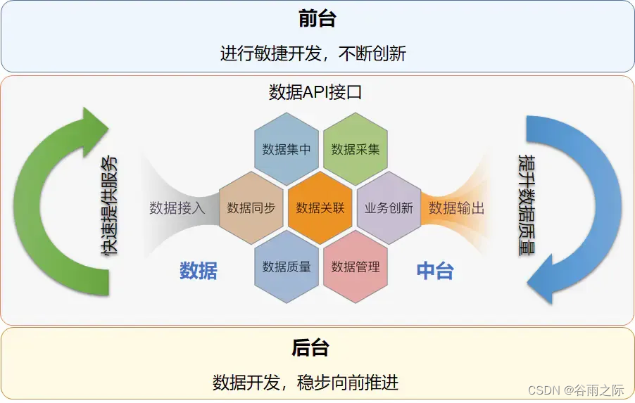 数据源为后台,数据治理和处理为中台,数据应用对接为前台。