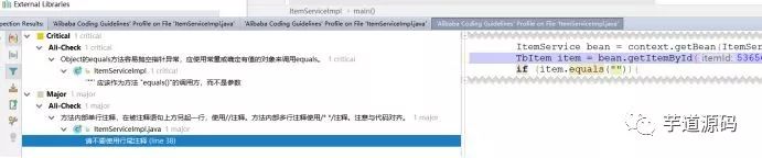 左边是扫描出的不符合规范的代码,依次点进去可以看到是代码的多少行出现了规约问题以及哪一个规约问题,右边则是规约的详细描述及实例代码。