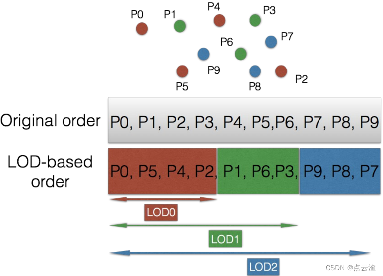 G-PCC提出了利用LOD对点云属性压缩的方法,现阶段LOD在点云压缩中的主要作用是属性信息的预测编码。