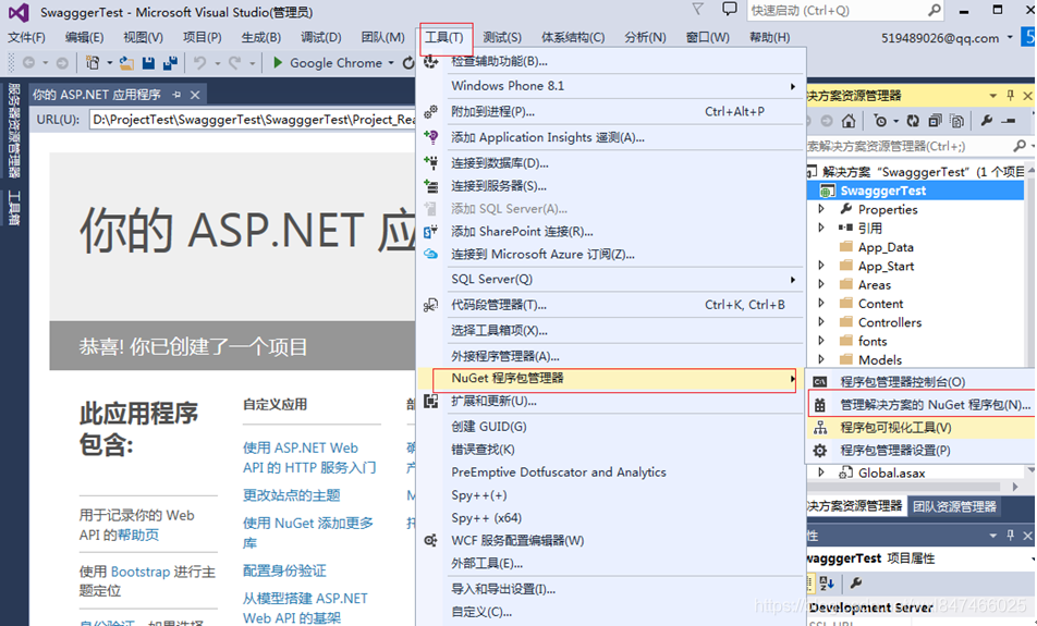 第一步:打开项目,选择工具----Nuget程序包管理器----管理解决方案的Nuget程序包,打开Nuget程序包管理器