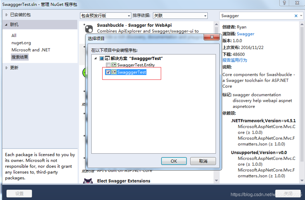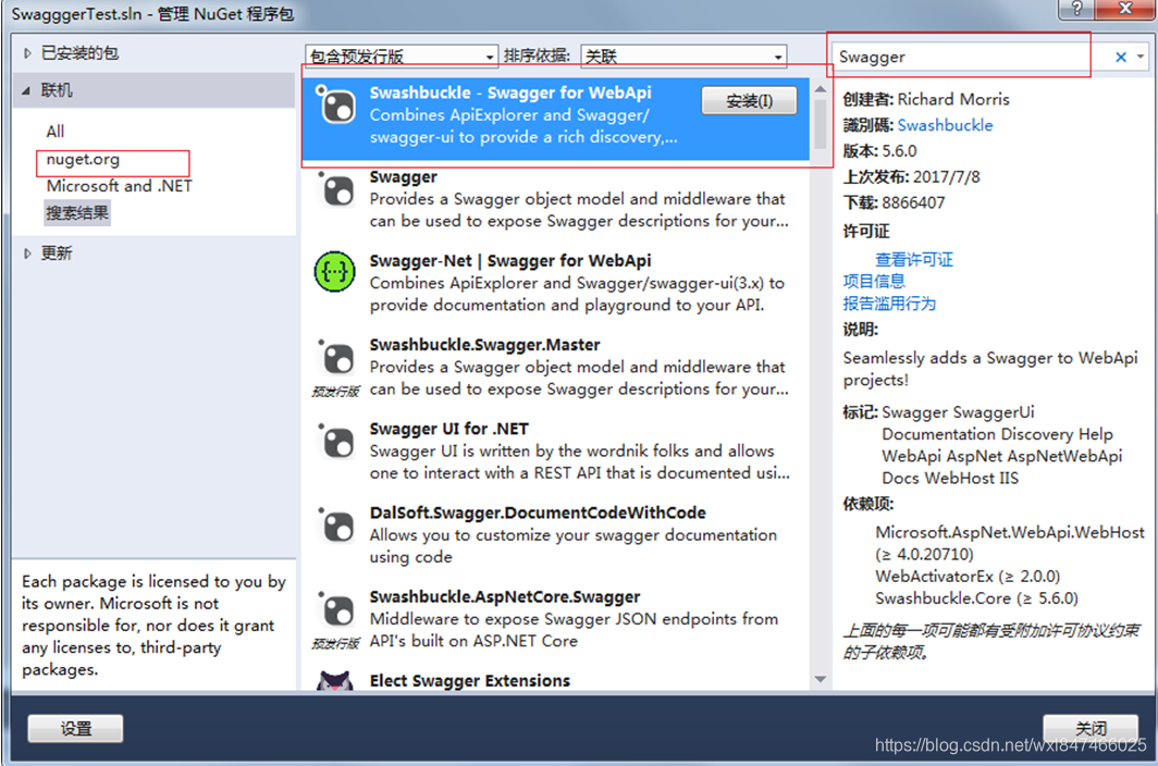 第二步:在Nuget程序包管理器中选择联机----nuget.org,在右侧的搜索框中输入“Swagger”,然后在搜索结果中点击Swashbuckle行的“安装”按钮。