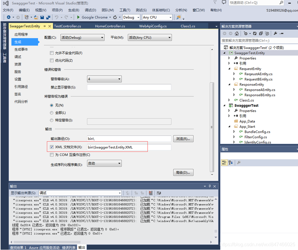 需要作此项配置的项目有控制器所在项目、传入传出参数类所在项目,在此DEMO中,参数类放在SwaggerTest.Entity项目中,控制器在SwaggerTest项目中,两个都需要配置。