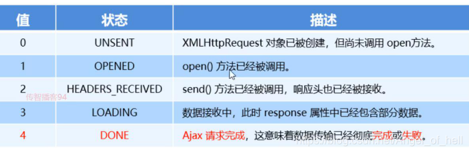 if(xhr.readyState === 4(请求完成) && xhr.status === 200(请求成功)) { //判断的属性的status是创建对象xhr里的属性,代表服务器响应的状态,不可以更改