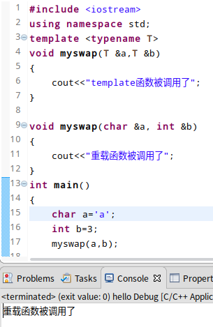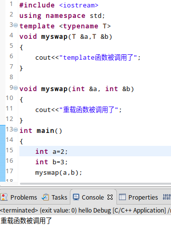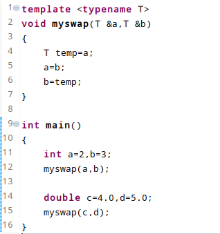 编译器会把第12行换成 myswap<int>(a,b) ,第15行换成 myswap<double>(c,d) ,而把这两个就叫做模板函数