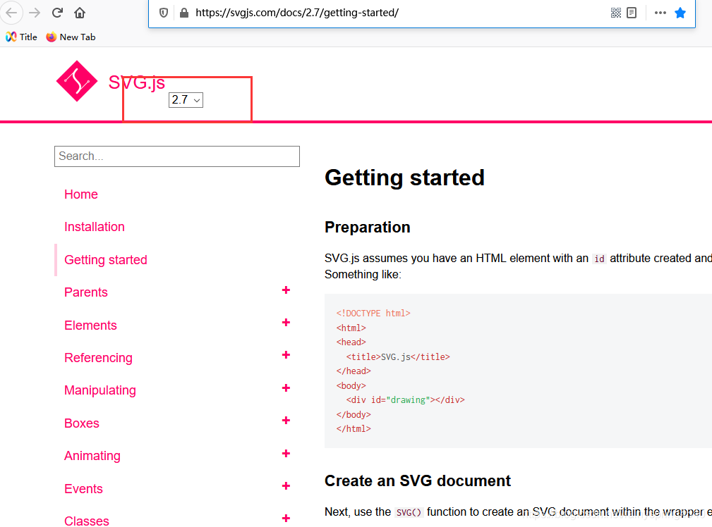 这里注意svg.js 官网的如图的版本地址。2.7和3的版本语法差别很大。这里采用2.7