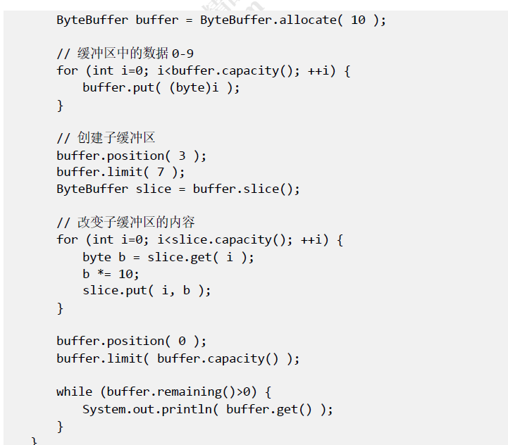 在该示例中,分配了一个容量大小为10 的缓冲区,并在其中放入了数据0-9,而在该缓冲区基础之上又创建了一个子缓冲区,并