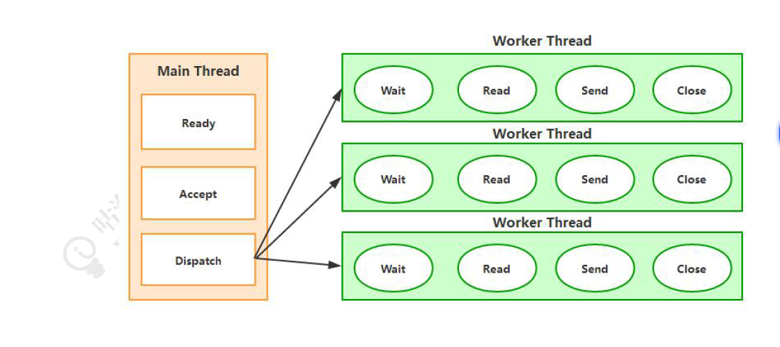 传统的Server/Client 模式会基于TPR(Thread per Request),服务器会为每个客户端请求建立一个线程,由该线程单独负责处理