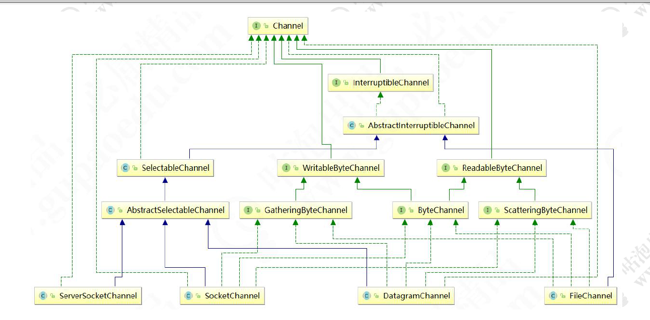 在NIO 中,提供了多种通道对象,而所有的通道对象都实现了Channel 接口。它们之间的继承关系如下图所示: