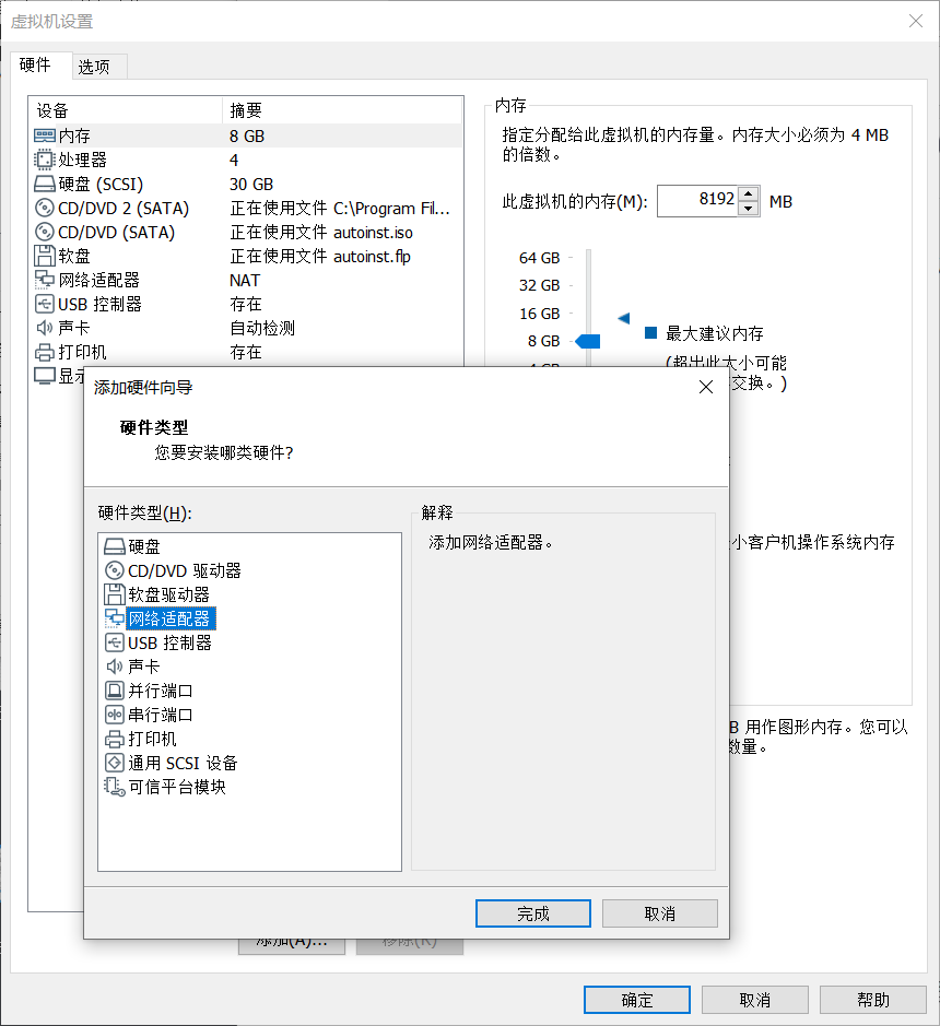 第二个是对某个具体的虚拟机进行设置网卡。可以给虚拟机添加多个网卡,连接不同的网络。比如说一个适配器以桥接的模式运行,一个以NAT模式运行。