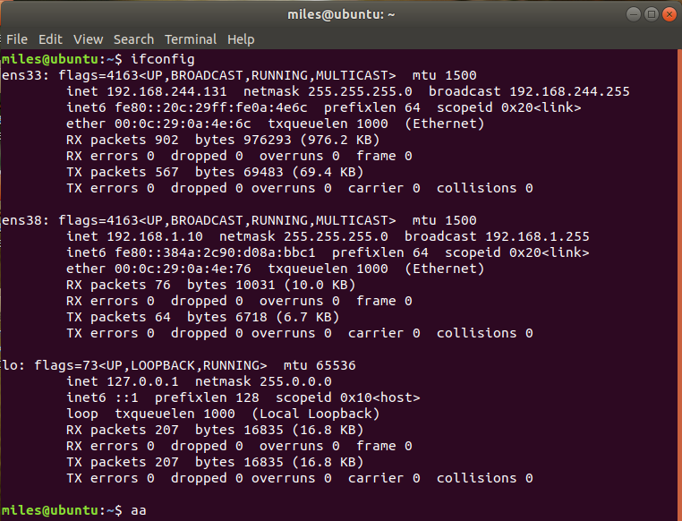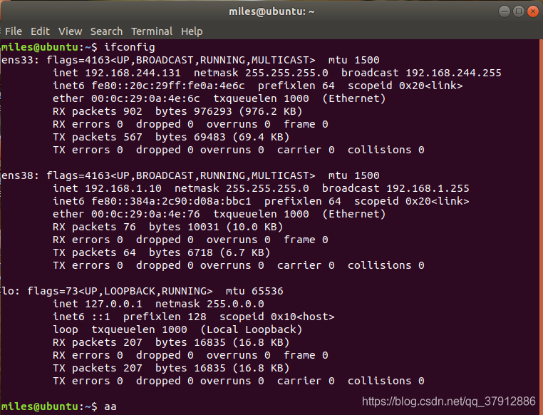 ifconfig 命令用来显示所有的网卡状态:下图所示ens33, ens38。下面那个我也不知道是啥,按IP地址来说是本机了。