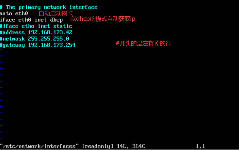 然后sudo vi /etc/network/interfaces 配置IP地址。