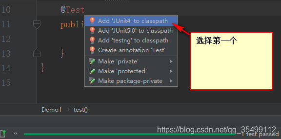 4. 导入junit依赖环境(idea开发工具自带的有junit的依赖环境,现在测试类写下@Test然后Alt+Ent键,选择junit4确认就可以了)如图: