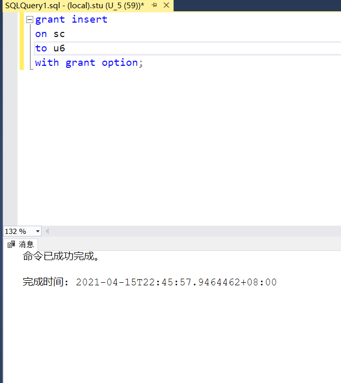[例4.5] 把对表SC的INSERT权限授予U5用户,并允许他再将此权限授予其他用户