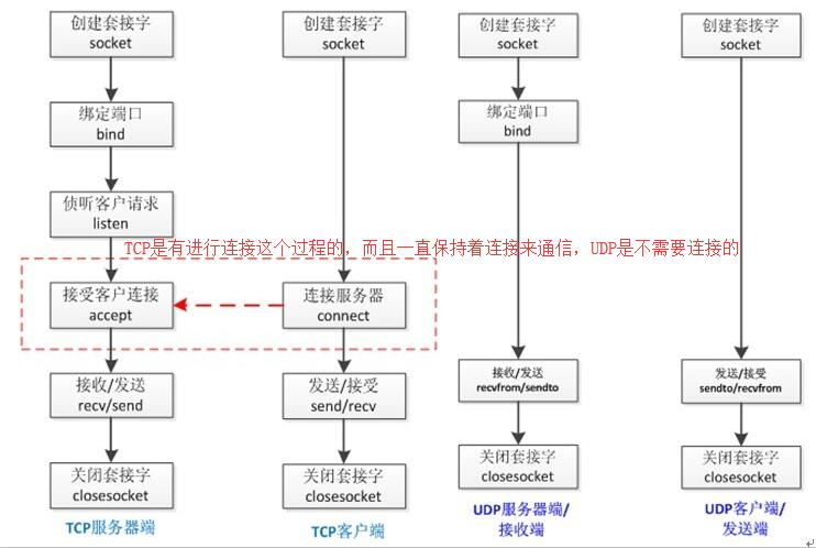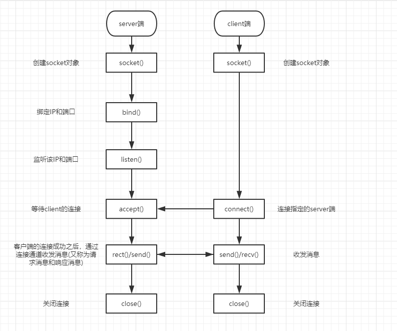 先从服务器端说起。服务器端先初始化Socket,然后与端口绑定(bind),对端口进行监听(listen),调用accept阻塞,等待客户端连接。在这时如果有个客户端初始化一个Socket,然后连接服务器(connect),如果连接成功,这时客户端与服务器端的连接就建立了。客户端发送数据请求,服务器端接收请求并处理请求,然后把回应数据发送给客户端,客户端读取数据,最后关闭连接,一次交互结束