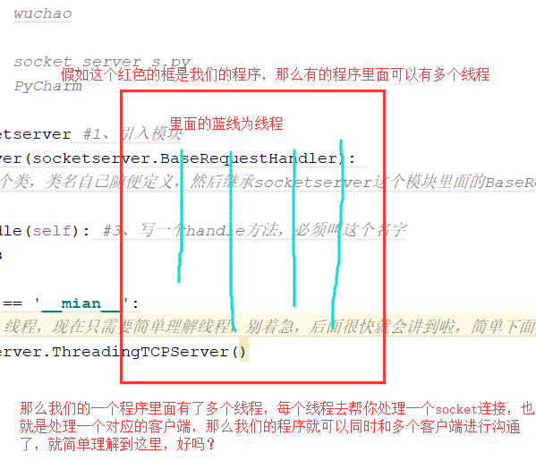 class MyServer(socketserver.BaseRequestHandler): #2、自己写一个类,类名自己随便定义,然后继承socketserver这个模块里面的BaseRequestHandler这个类