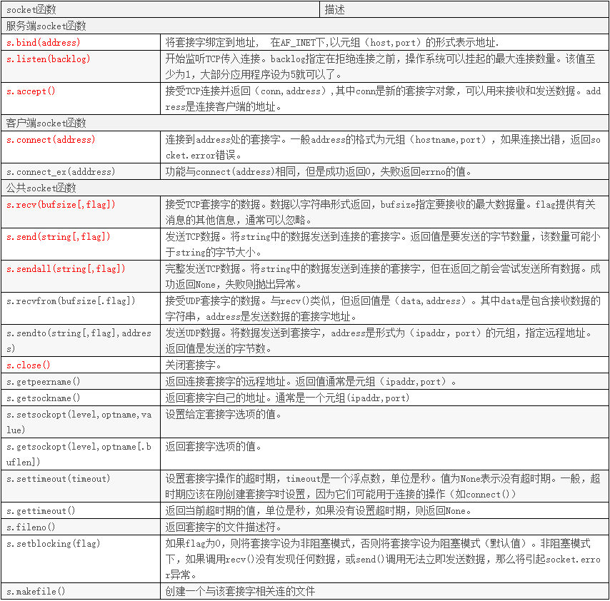 服务端套接字函数 s.bind() 绑定(主机,端口号)到套接字 s.listen() 开始TCP监听 s.accept() 被动接受TCP客户的连接,(阻塞式)等待连接的到来 客户端套接字函数 s.connect() 主动初始化TCP服务器连接 s.connect_ex() connect()函数的扩展版本,出错时返回出错码,而不是抛出异常 公共用途的套接字函数 s.recv() 接收TCP数据 s.send() 发送TCP数据(send在待发送数据量大于己端缓存区剩余空间时,数据丢失,不会发完) s.sendall() 发送完整的TCP数据(本质就是循环调用send,sendall在待发送数据量大于己端缓存区剩余空间时,数据不丢失,循环调用send直到发完) s.recvfrom() 接收UDP数据 s.sendto() 发送UDP数据,note:sendto()函数和send()函数的不同在于,sendto()第二个参数是recvfrom()返回的第二个参数即地址 s.getpeername() 连接到当前套接字的远端的地址 s.getsockname() 当前套接字的地址 s.getsockopt() 返回指定套接字的参数 s.setsockopt() 设置指定套接字的参数 s.close() 关闭套接字 面向锁的套接字方法 s.setblocking() 设置套接字的阻塞与非阻塞模式 s.settimeout() 设置阻塞套接字操作的超时时间 s.gettimeout() 得到阻塞套接字操作的超时时间 面向文件的套接字的函数 s.fileno() 套接字的文件描述符 s.makefile() 创建一个与该套接字相关的文件