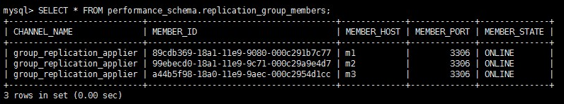 SELECT * FROM performance_schema.replication_group_members; #查看组成员状态