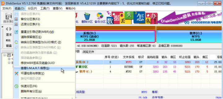 1、在PE系统中打开DiskGenius分区工具,选择电脑硬盘前先选择:硬盘-查询S.M.A.R.T.信息内容。