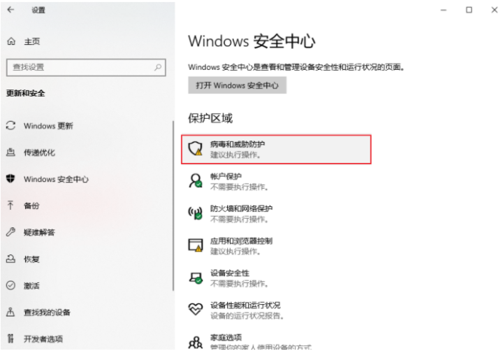 3、在windows安全管家页面下,鼠标单击病毒和威协维护。
