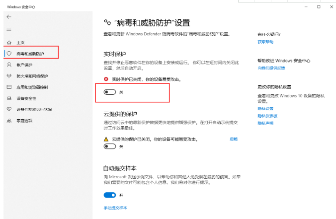 4、然后在病毒和威协安全防护设置中,及时关闭维护即可。
