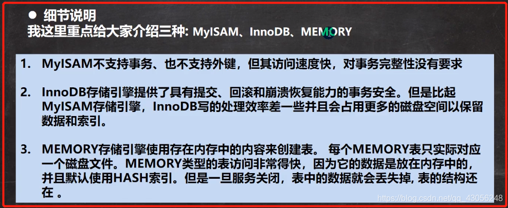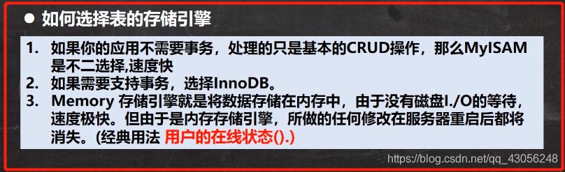memory:数据存储在内存中【重启mysql服务,数据丢失,但是表结构还在】,执行速度快(没有 IO 读写),默认支持索引(hash 表)