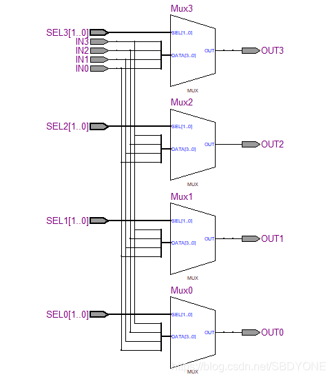 module top( IN0, IN1 ,IN2 ,IN3 ,SEL0,SEL1,SEL2,SEL3,OUT0,OUT1,OUT2,OUT3);