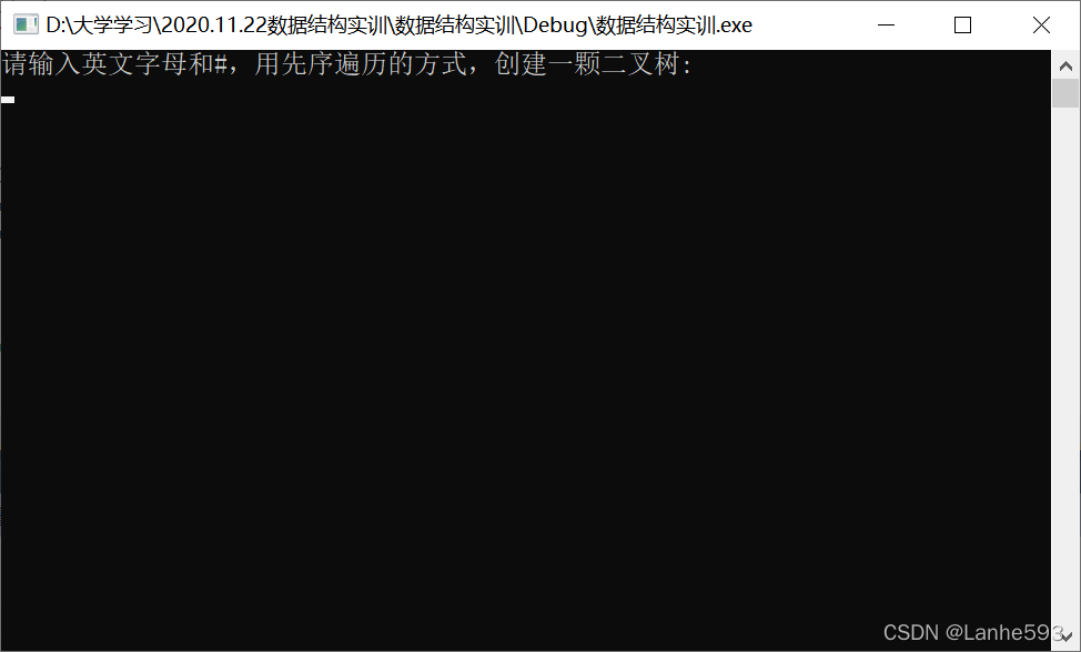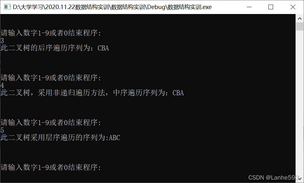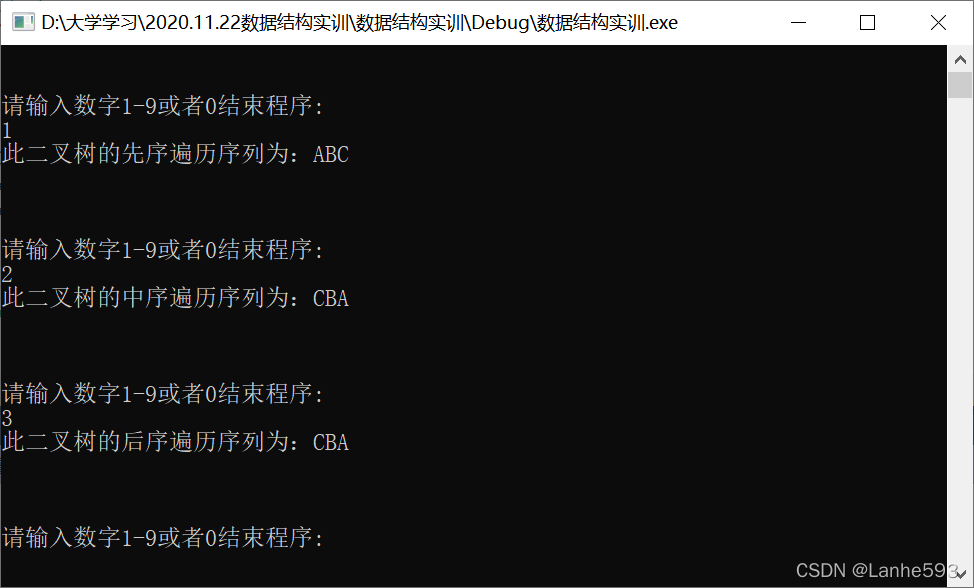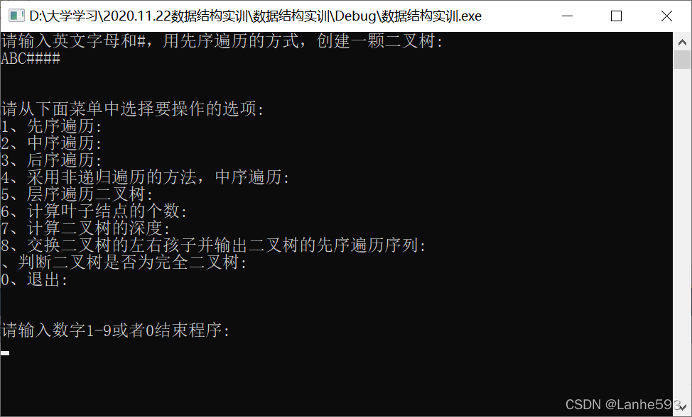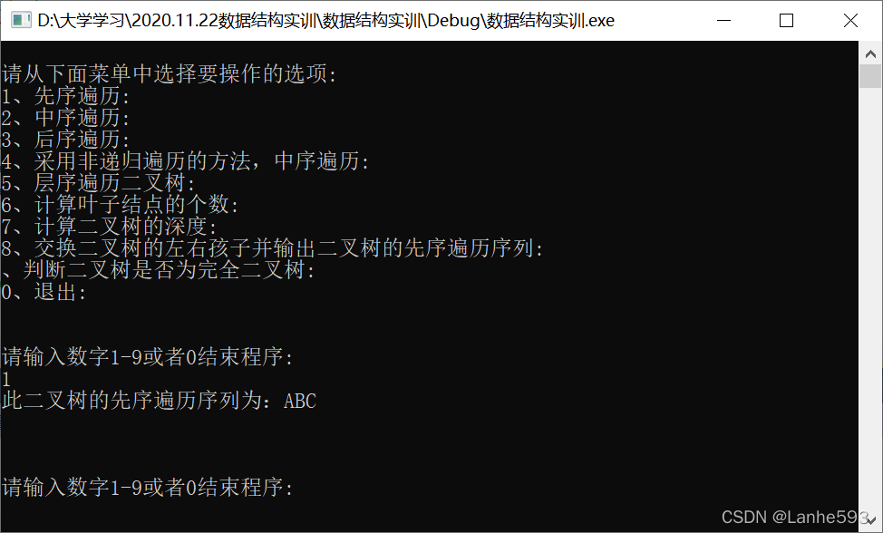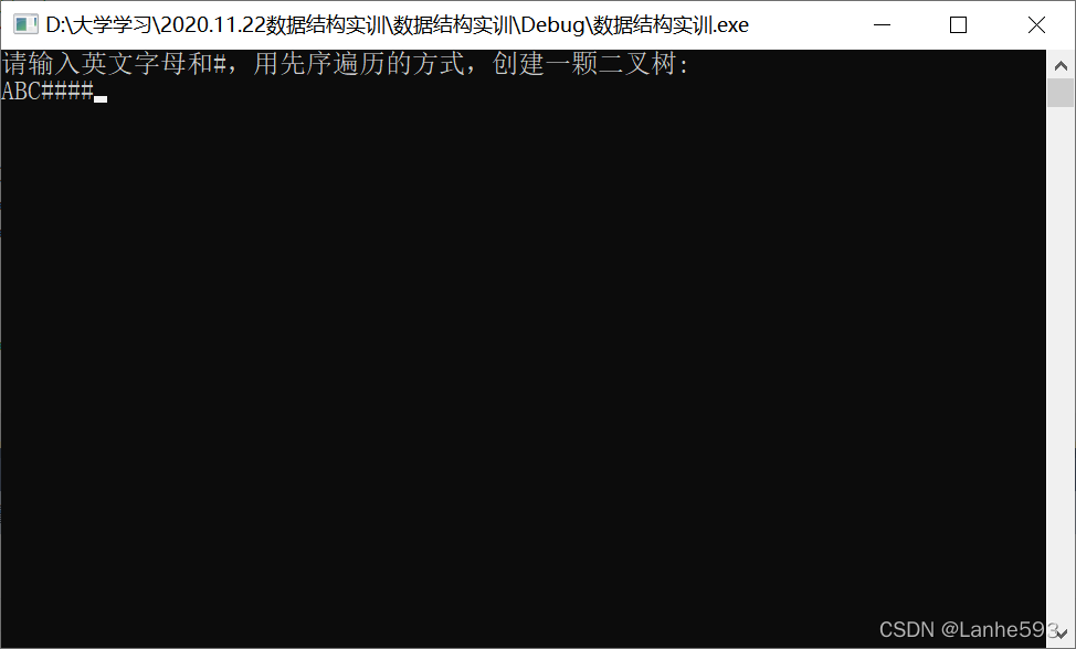 - 运行程序,先序输入一颗二叉树:ABC####。注意在先序输入二叉树时一定要把左右孩子为空的情况考虑到,用“#”来代表空。
