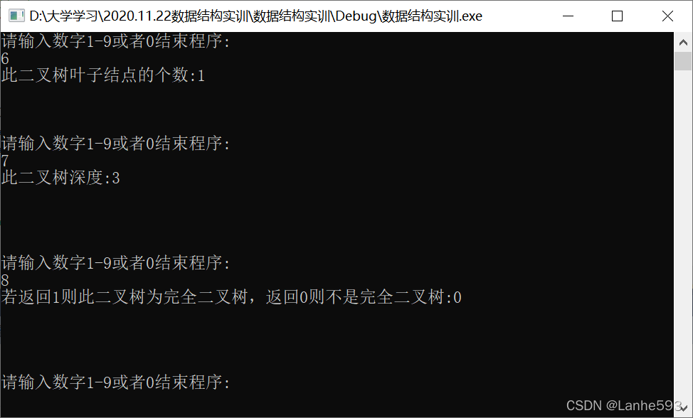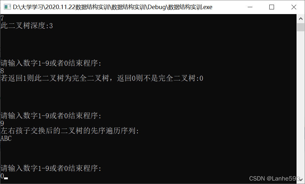 - 输入数字9,判断二叉树是否为完全二叉树,若为完全二叉树则输出1,否则输出0。