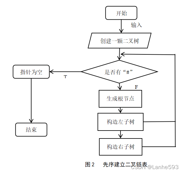 (1)利用二叉链表先序建立二叉树的存储结构。算法流程图如图2所示。