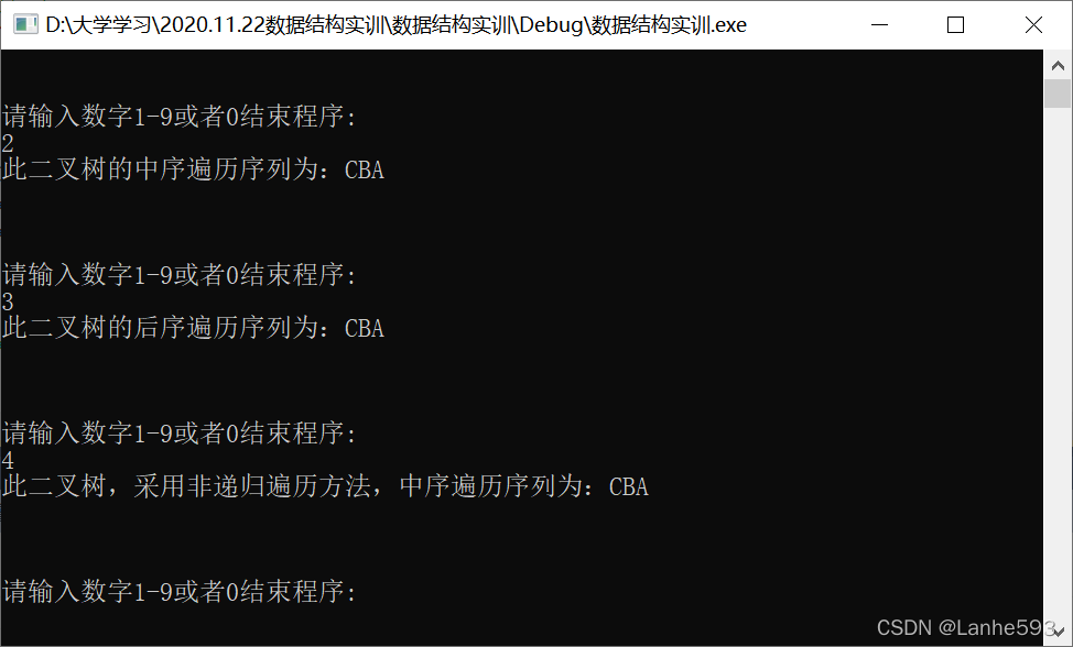 二叉树的遍历:首先利用二叉链表先序建立二叉树的存储结构,输入一颗二叉树,利用菜单功能依次选择调用PreOrder函数、InOrder函数、PostOrder函数实现二叉树的先序、中序、后序递归遍历,调用LevelOrderTraversal函数利用队列实现二叉树的层序遍历,调用InOrderTraverse函数利用栈实现二叉树的中序非递归遍历。