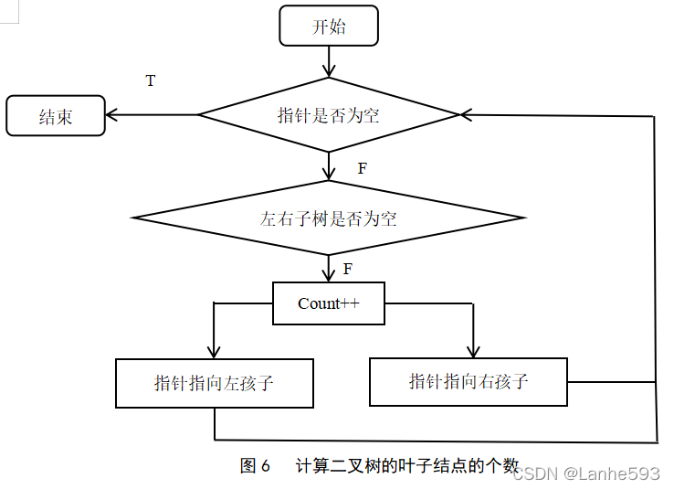 (5)二叉树的应用算法—计算叶子结点的个数。算法流程图如图6所示。