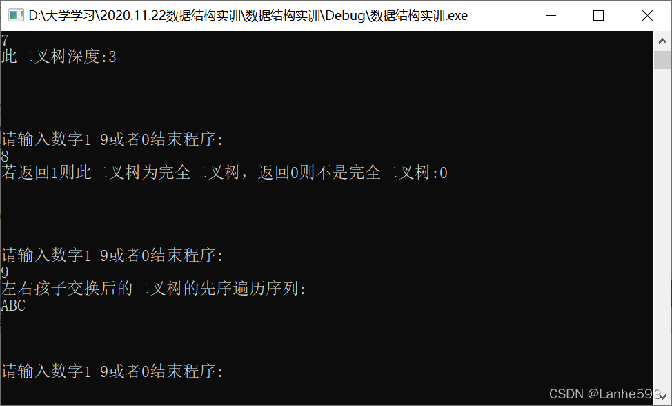 二叉树的应用算法:构造函数实现二叉树的各种应用算法,再通过调用函数的方式计算一颗二叉树的叶子结点的个数、求二叉树的深度、将二叉树的左右孩子互换、判断二叉树是否为完全二叉树。
