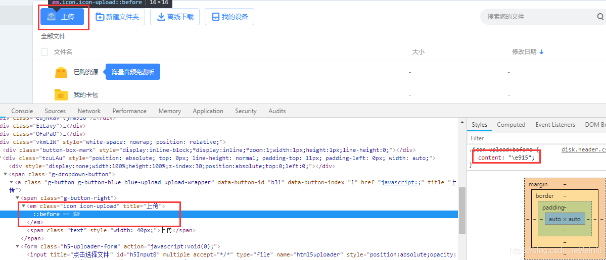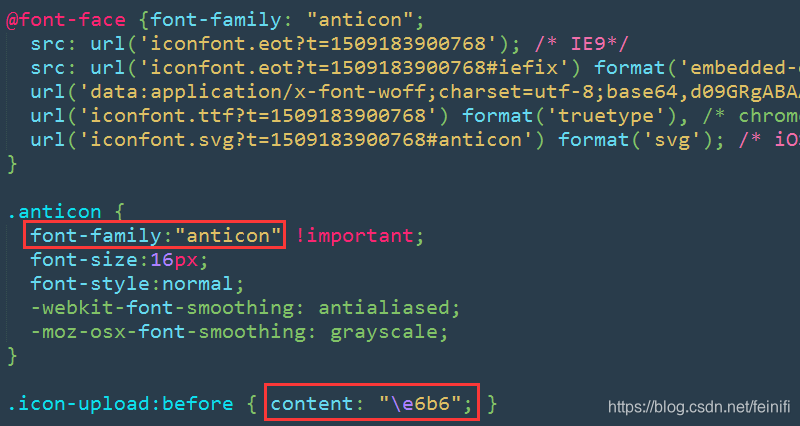 在iconfont.css文件中,定义了图标字体,并且将常用的icon都做了样式定义。这里需要上传图标,所以需要icon样式的元素再加上icon-upload样式即可。