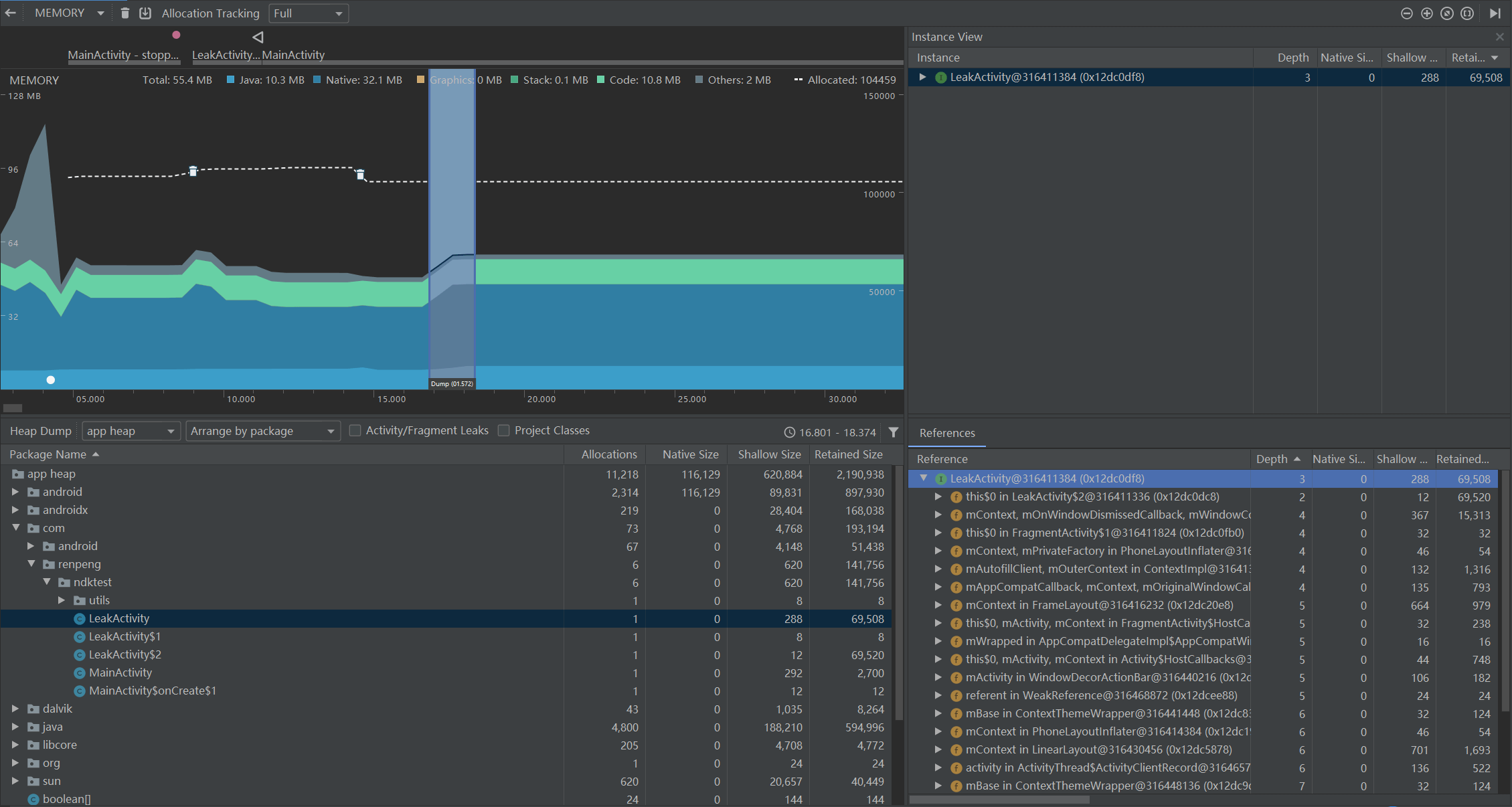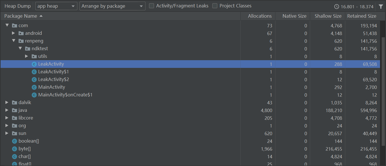 如果 Shallow Size 和 Retained Size 都非常小并且相等,都可以认为是已经被回收的对象(空的 Activity,大概是270)。但是 LeakActivity 明显不是这样,也说明了 LeakActivity 发生了内存泄漏。