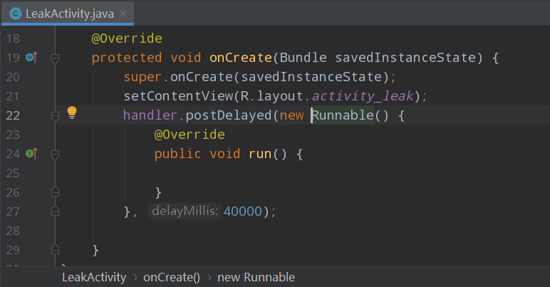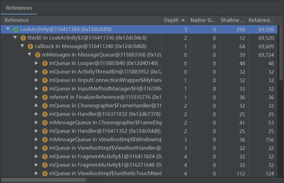LeakActivity$1 和 LeakActivity$2 分别表示 LeakActivity 中第1个和第2个匿名内部类(编译的时候由系统自动起名为外部类名$1.class)对 LeakActivity 的引用。