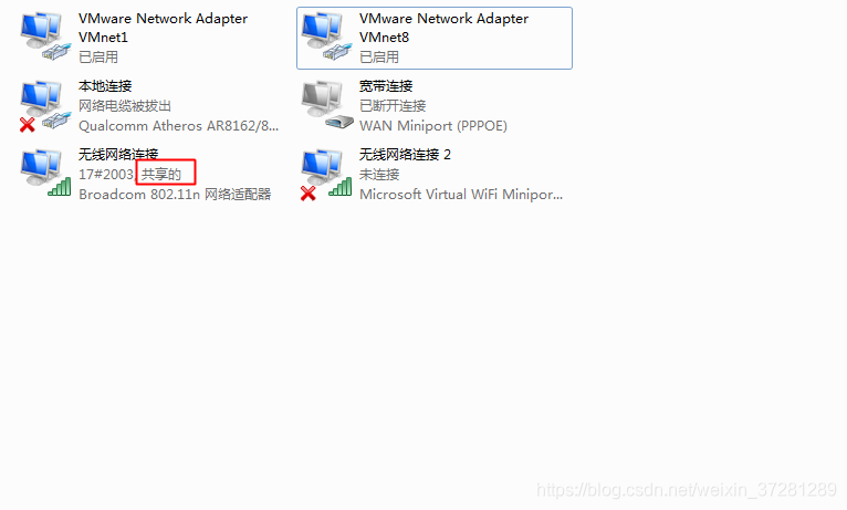 打开网络和共享中心-> 更改适配器设置 如下图就是开了共享