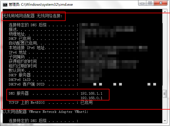 找到你当前连接上网的地方, 因为我电脑是连接无线 ,所以在无线网络连接区域下 , 如果是连接有线的有可能就是叫本地连接这个区域, 然后找到此区域下的dns服务器项 并记下来.