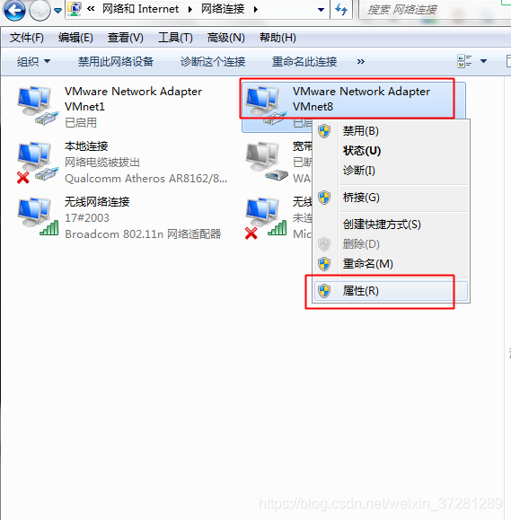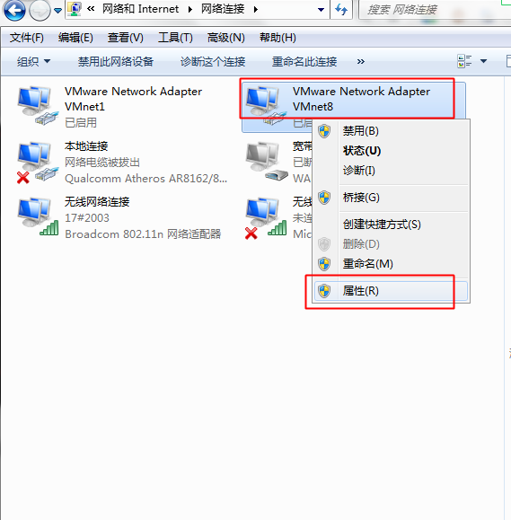 然后打开 网络界面 ,在vmnet 8上右键 点击属性, 如下图