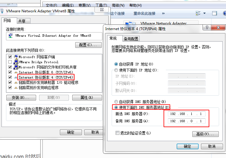 之后会弹出vmnet8属性窗口,双击Internet 协议版本 4, 弹出 Internet 协议版本 4 属性窗口 ,然后重点来了