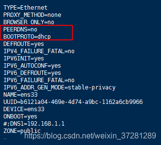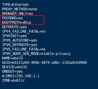 找到BOOTPROTO项看是不是等于 dhcp,如果是那么加上 PEERDNS=no这句( 这是为了防止重启服务导致 刚配置resolv.conf文件会被改变, 为了免于再次配置 所以加上这句)